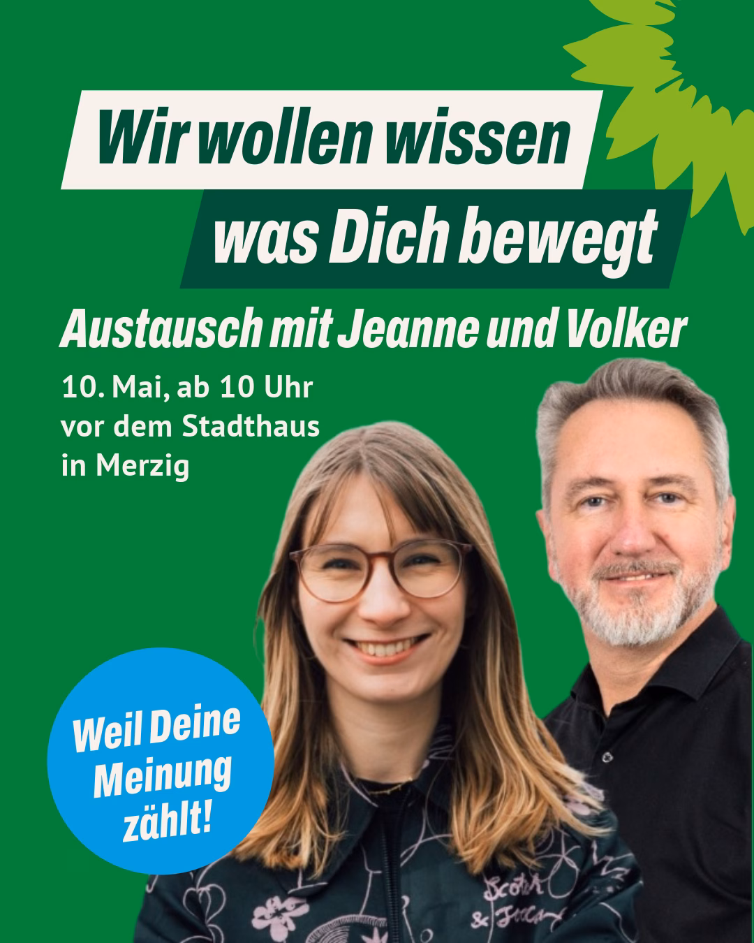 Am Samstag, 10.05.2025 sind die Grünen Merzig mit einem Informationsstand vor dem Stadthaus vertreten.