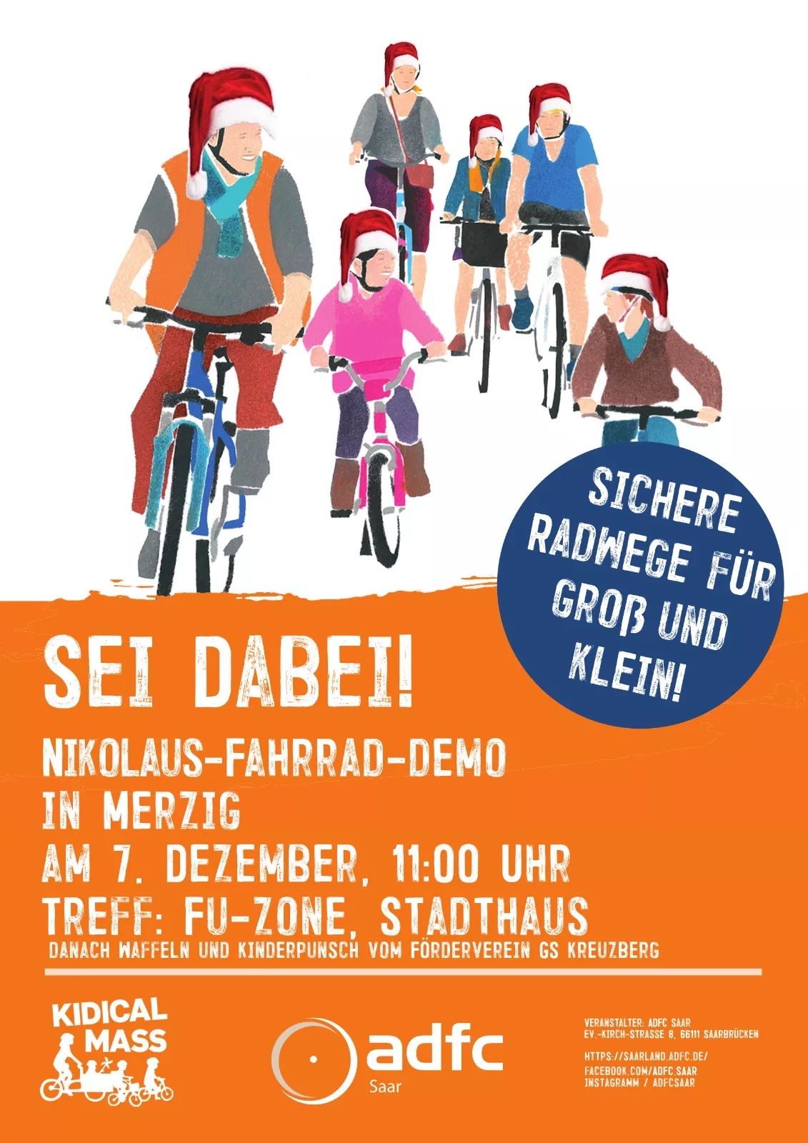 Gerne weisen wir an dieser Stelle auf die Nikolaus-Fahrrad-Demo des ADFC Saar hin. Unter dem Motto sichere Radwege für Groß und Klein startet die Demo am 7.12. um 11:00 am Stadthaus Merzig.